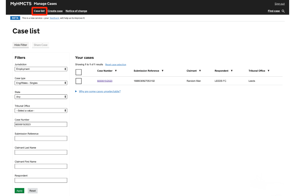 Once you have signed in to MyHMCTS, you will see your case list: