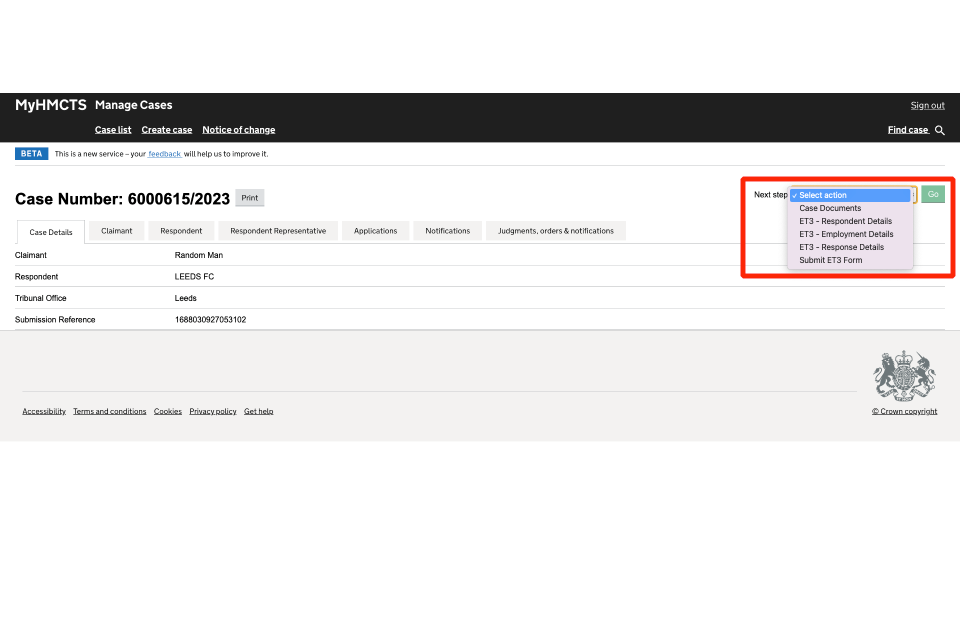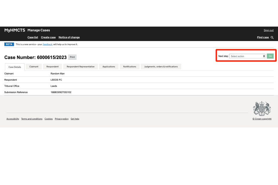 There will be several tabs which will show the details of the case, claimant details, respondent or respondent representative details and case management tabs. You can access case documents such as ET1, Acas certificate and other supporting documents by selecting the ‘Case Documents’ from the ‘Next steps’ actions.