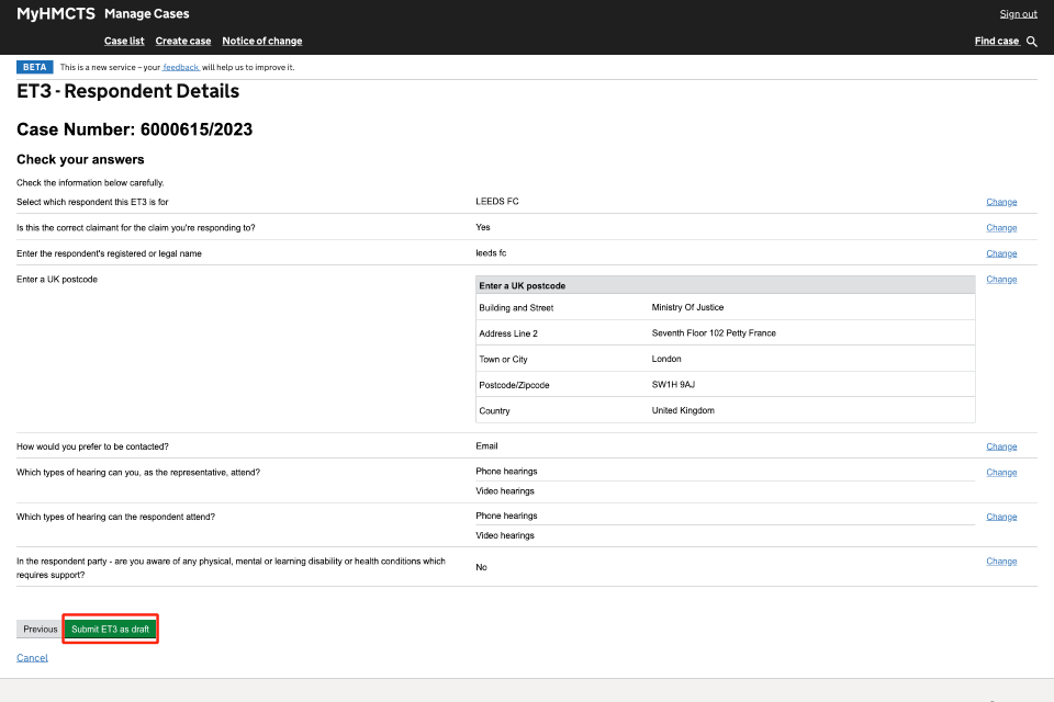 6. Check your answers in each of the 3 sections. If you need to make any changes, select ‘Change’. If all your answers are correct, select ‘Submit ET3 as draft’.