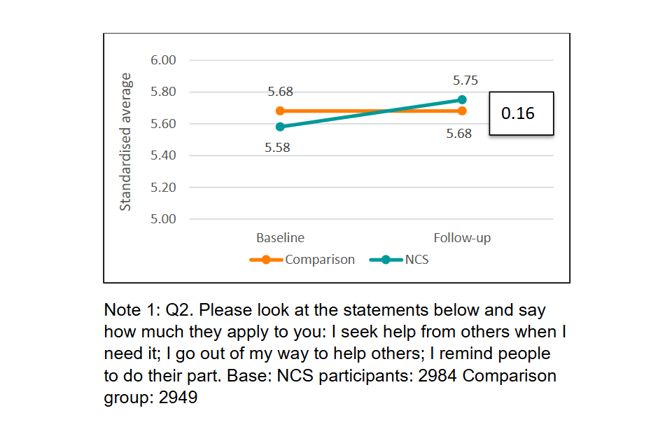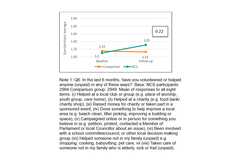 Q6. In the last 6 months, have you volunteered or helped anyone (unpaid) in any of these ways?: Base: NCS participants: 2984 Comparison group: 2949 Mean of responses to all eight items: (i) Helped at a local club or group (e.g. place of worship, youth group, care home), (ii) Helped at a charity (e.g. food bank/ charity shop), (iii) Raised money for charity or taken part in a sponsored event, (iv) Done something to help improve a local area (e.g. beach clean, litter picking, improving a building or space), (v) Campaigned online or in person for something you believe in (e.g. petition, protest, contacted a Member of Parliament or local Councillor about an issue), (vi) Been involved with a school committee/council, or other local decision-making group (vii) Helped someone not in my family (unpaid) e.g. shopping, cooking, babysitting, pet care, vii (viii) Taken care of someone not in my family who is elderly, sick or frail (unpaid). ↩