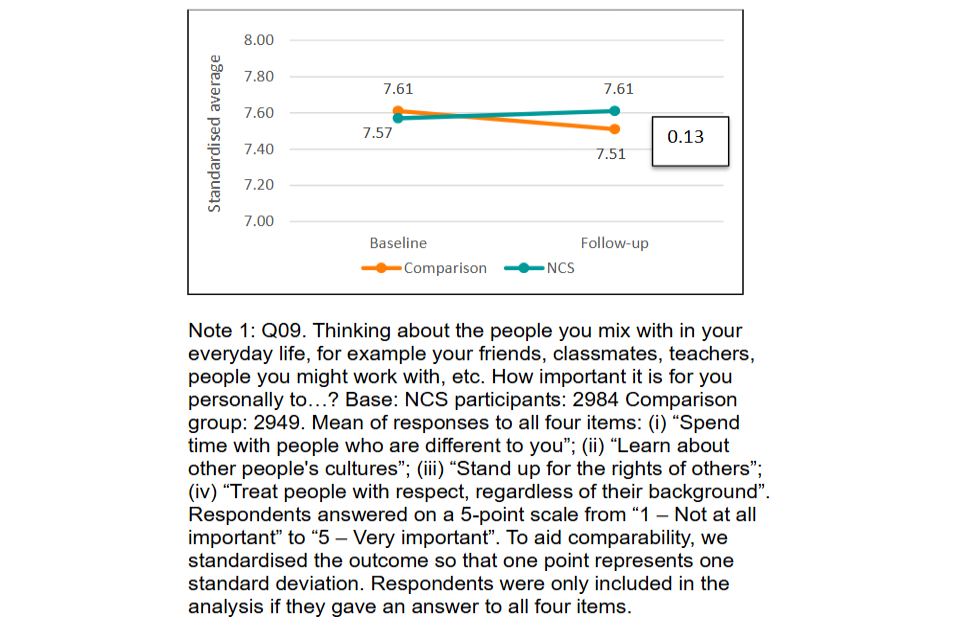Note 1: Q09. Thinking about the people you mix with in your everyday life, for example your friends, classmates, teachers, people you might work with, etc. How important it is for you personally to…? Base: NCS participants: 2984 Comparison group: 2949. Mean of responses to all four items: (i) “Spend time with people who are different to you”; (ii) “Learn about other people’s cultures”; (iii) “Stand up for the rights of others”; (iv) “Treat people with respect, regardless of their background”. Respondents answered on a 5-point scale from “1 – Not at all important” to “5 – Very important”. To aid comparability, we standardised the outcome so that one point represents one standard deviation. Respondents were only included in the analysis if they gave an answer to all four items.