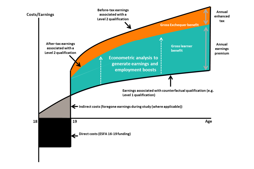 Note again that the indirect costs associated with qualification attainment, in terms of the foregone earnings during the period of study, are already deducted from the gross learner benefit. ↩