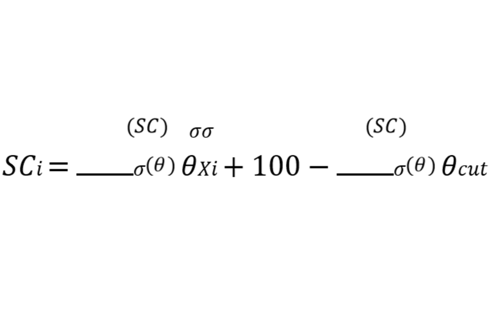 ‘SC’ is the scaled score, ‘θXi’ is the IRT ability value corresponding to the raw score Xi, and ‘θ cut’ is the IRT ability value representing the expected standard cut score. Scaled scores were rounded down to the integer below. For the purposes of the scaled score calculation, theta was estimated using the summed score likelihood-based approach as implemented in flexMIRT, a specialist IRT software package.
