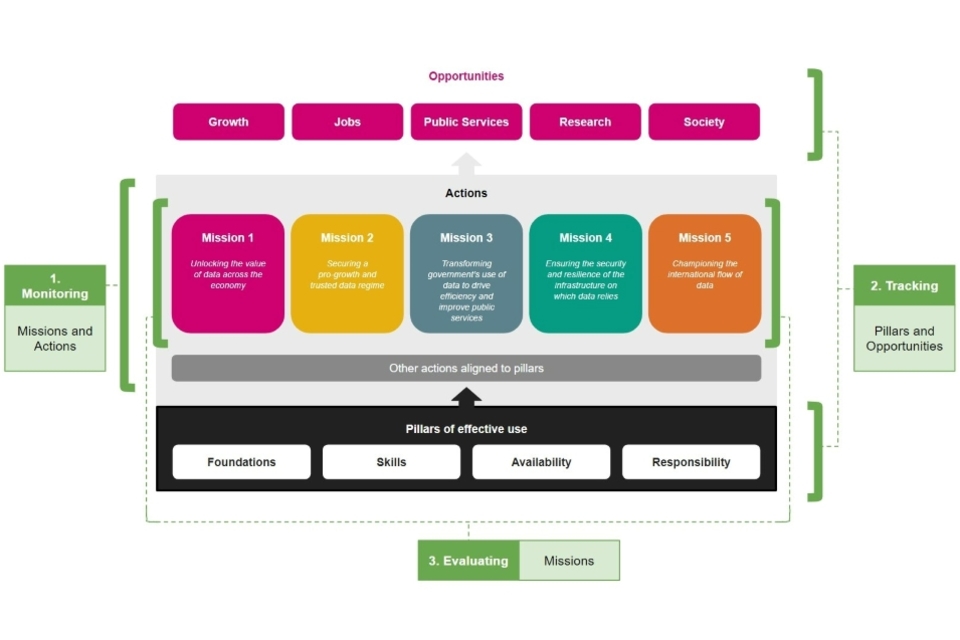 To do this, we have created a monitoring and evaluation framework for the National Data Strategy. This will track delivery of government’s interventions, assess their effectiveness, and enable us to plan for further interventions in the future.