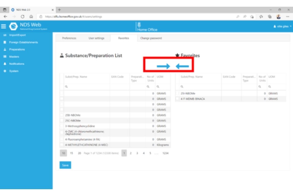 Use the blue arrows to add or remove Substances/Preparations to your Favourites list. When finished, click ‘Save’ at the bottom of the page.