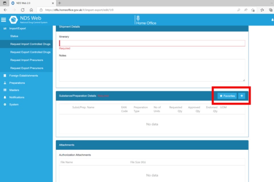 If you now begin a new ‘Request Import Controlled Drugs’ request, when you come to the Substance/Preparation Details, you will see a blue box that either says ‘Favourites’ or ‘All’. Make sure ‘Favourites’ is selected, then click the plus (+) icon to select from the dropdown list.