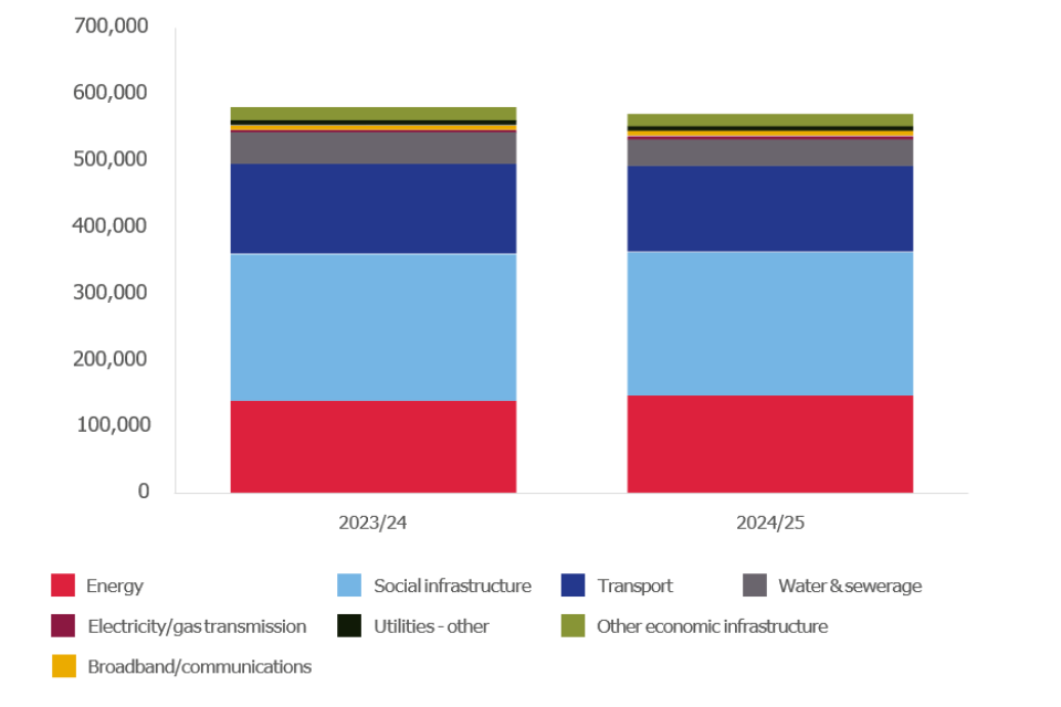 4.1 The UK’s major infrastructure pipeline represents projects financed by public and private funding sources - Chart 2 sets out the funding split of each sector of the pipeline to 2024/25[footnote 16]. Energy and utilities (water and electricity/ gas transmission), both privatised sectors, have high proportions of privately financed infrastructure projects. Private finance will play an important role in the UK’s transition to Net Zero. In contrast, transport and social infrastructure projects are funded predominantly by the public sector, or through a mixed funding approach (public and private).