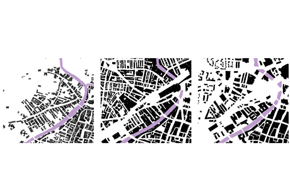 [Alt text: A series of three figure ground diagrams, where the buildings are coloured in black and the rest of the features are left blank. The three maps show the evolution of the urban form of a town from the 1800’s, through the 1900’s and up to the present day. The first image shows fine grain development in regular plots, taking up only half to two thirds of the frame. In the second image the whole frame is filled with buildings and we can see the arrival of a large train station. In the final image some of the fine grain development has been replaced with larger blocks and there are empty spaces where the built form has been fractured.]