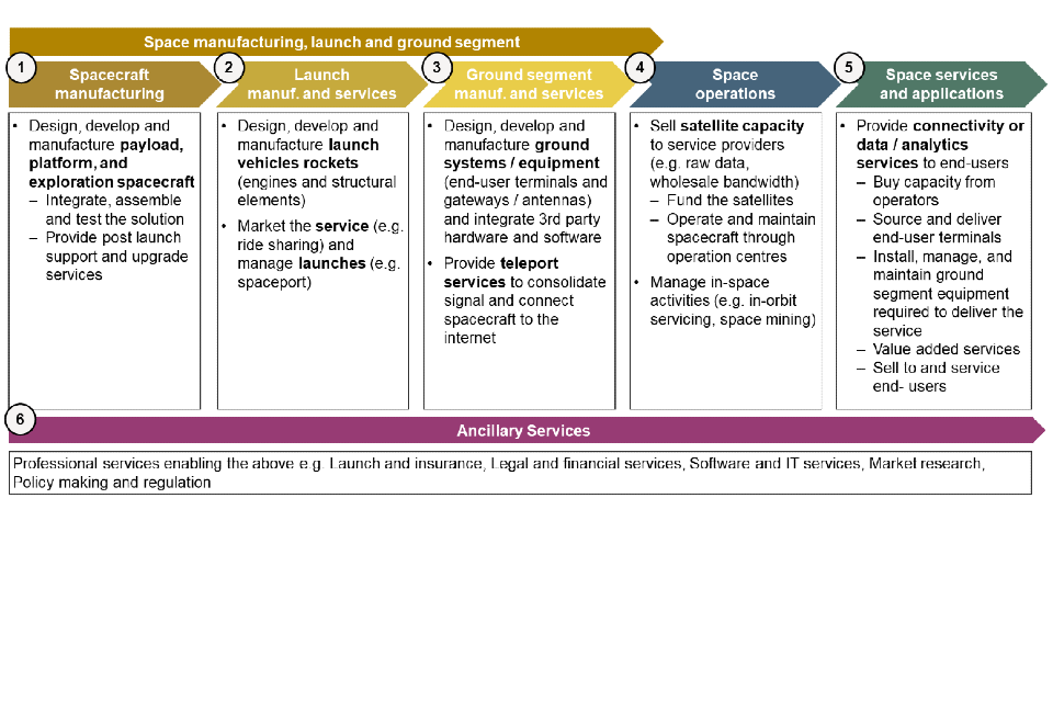 In order to be able to compile and compare third party estimates, the model defines six segments in the space sector value chain. The diagram below shows the value chain definition, with descriptors for each segment.
