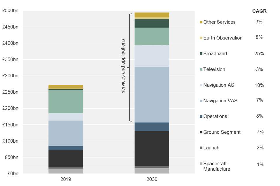 In aggregate terms, the Market Model estimates the size of global space sector to be around $350bn (£270bn) in 2019. The global space sector is forecast to grow up to around $630bn (£490bn) in 2030. This equates to growth of around 80% over 11 years, or alternatively a compound annualised growth rate of 5.6%.