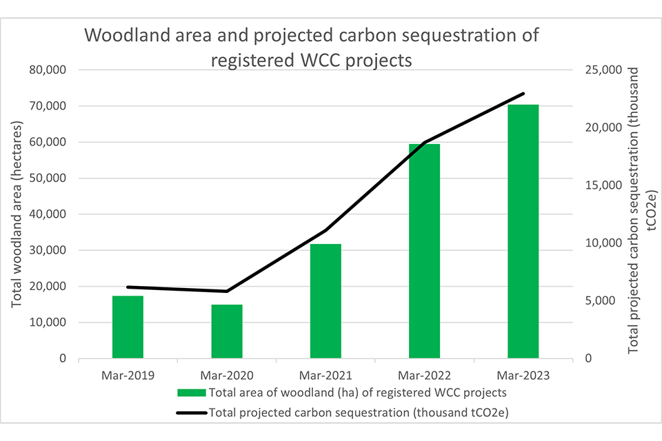 Figure 1: graph showing the change in total area of woodland (ha) of registered Woodland Carbon Code projects in the UK, and total projected carbon sequestration (thousand tCO2e), over time. The date range is from March 2019 to March 2023.
