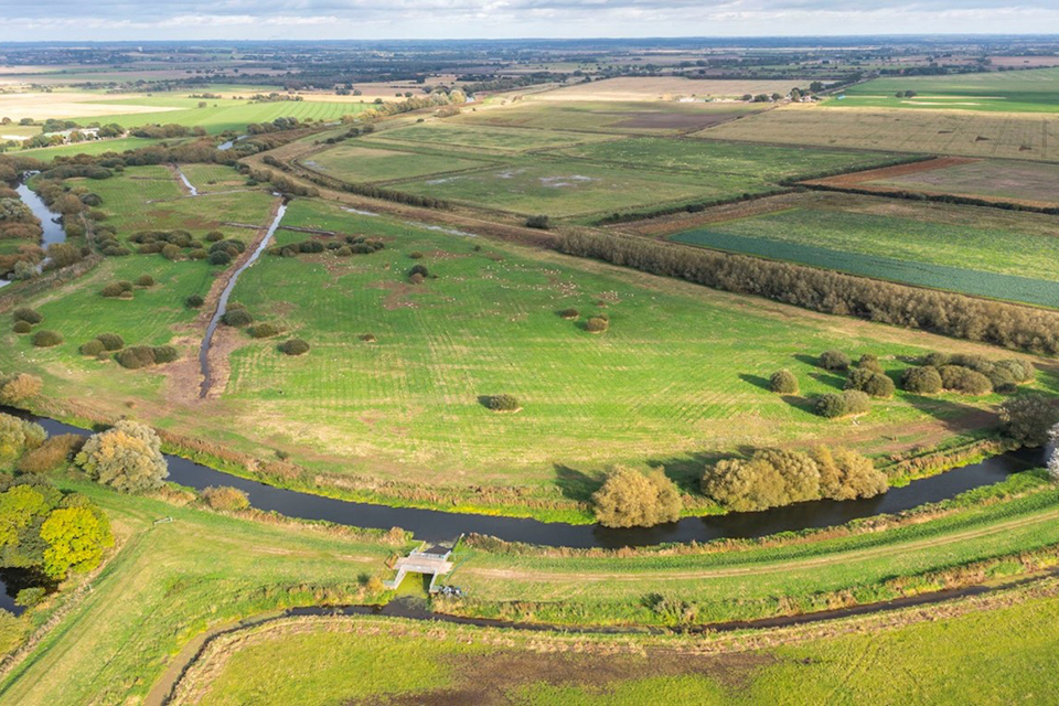 Aerial photograph of green fields and a curving river, courtesy of the Lapwing Estate.
