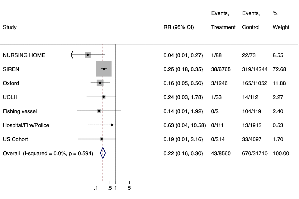 - The overall estimate of the relative risk across all studies was 0.22 (0.16-0.30) corresponding to a protective efficacy of 78% (95% CI 70% to 84%) – figure 1. The study results can be categorised into three types of result (See table 1 and figures in appendix).