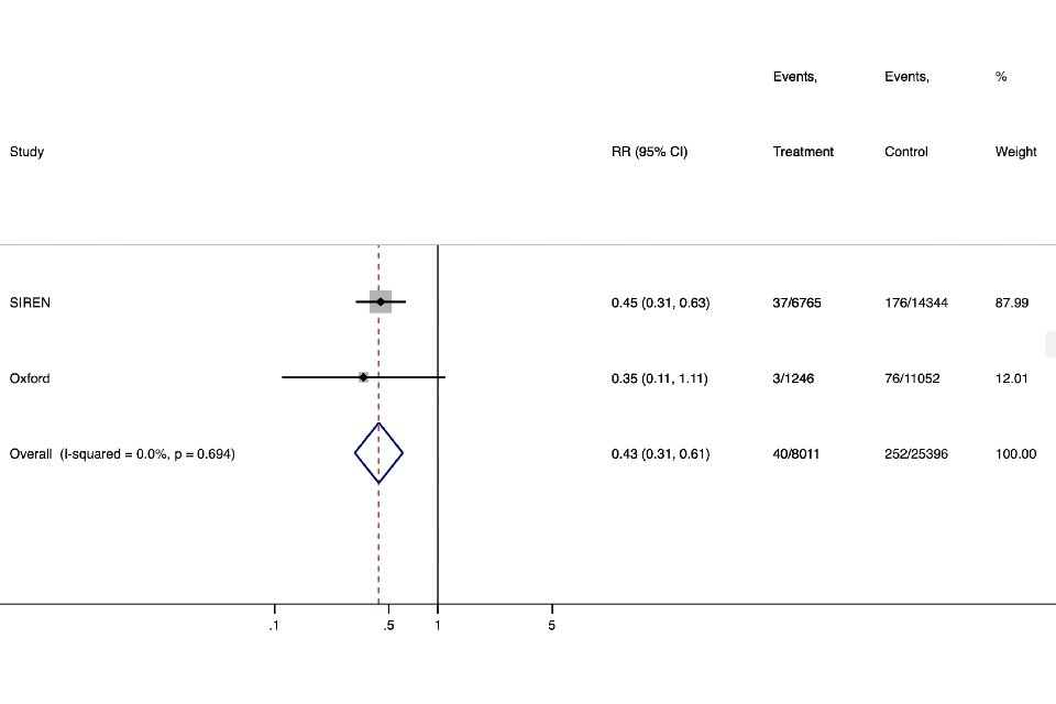 Graph shows the overall relative risk of infection was 0.43 (95%CI 0.31-0.61) corresponding to a protective effectiveness against asymptomatic infection of 57% (95% CI 49%-69%).