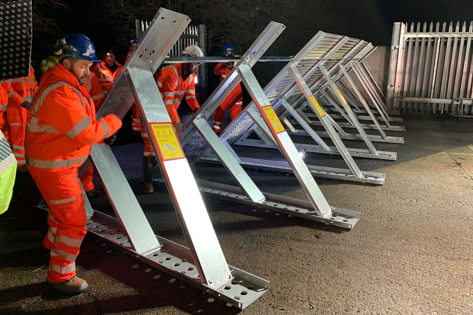 Environment Agency staff successfully trialed installing this temporary flood barrier across the railway on 7 November 2021. It is the first of its type in the UK. This exercise was arranged to coincide with planned railway engineering works to avoid disruption to the local community.