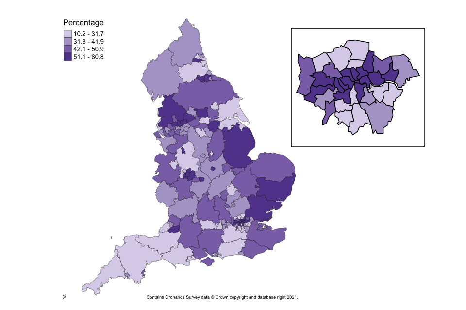 Figure A is a map of England broken into local authority areas to show the proportion of people completing an NHS Health Check between 2015 and 2020. It shows whether a local authority is in one of the 4 following categories: 10.2 to 31.7%, 31.8% to 41.9%, 42.1% to 50.9% or 51.1% to 80.8%. The data for this map is available in annex B, appendix 1.