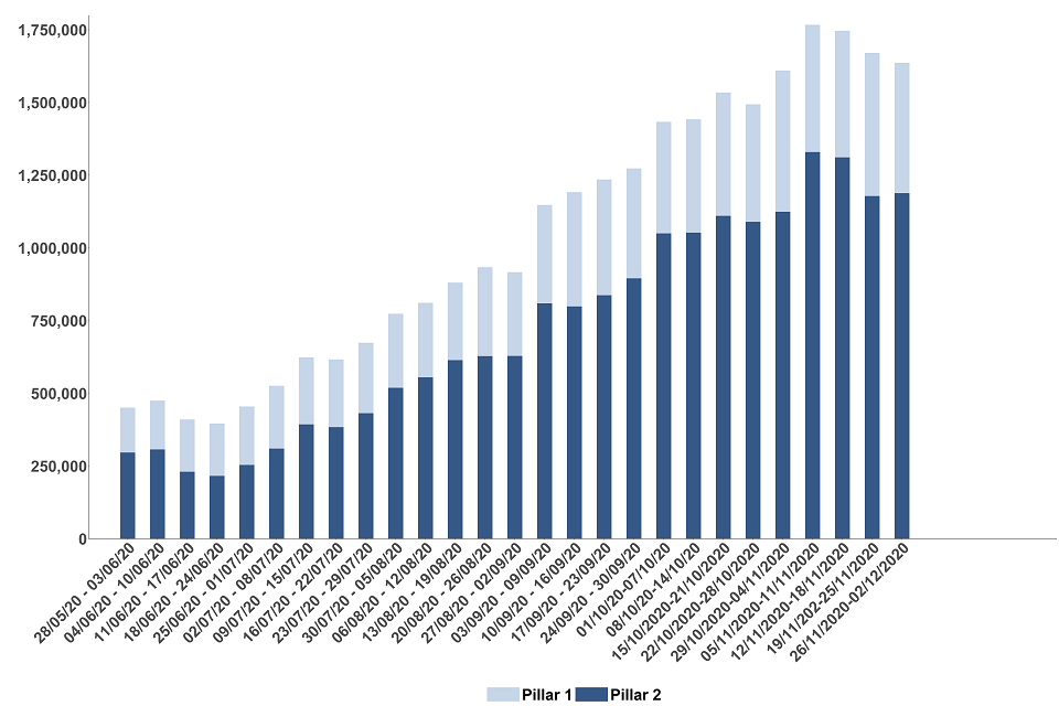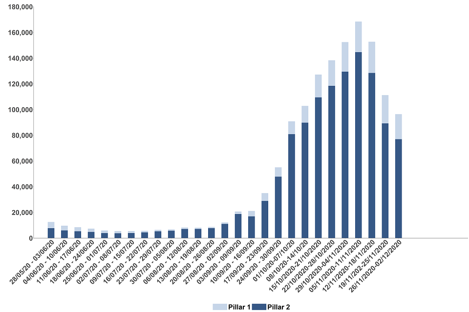 The number of people tested in each reporting week has decreased since reaching a peak in the week of 5 November to 11 November. The number of people tested between 26 November to 2 December has decreased by 7% compared to this peak. However, the number of people tested is still higher than at the end of August, having increased overall by 79% since the week of 27 August to 2 September. Over the same time period, there has been a 56% increase in the number of people tested under pillar 1 (testing in hospitals and outbreak locations) and an 89% increase under pillar 2 (national virus testing).