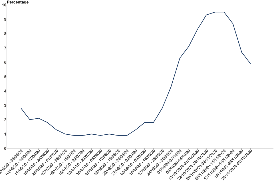 Between 26 November and 2 December, 96,415 people tested positive in the latest reporting week.[footnote 5] This is 5.9% of people tested during this week. This is 6.7% of people tested during this week. The number of positive cases and percentage of people testing positive has decreased over the past 3 weeks.