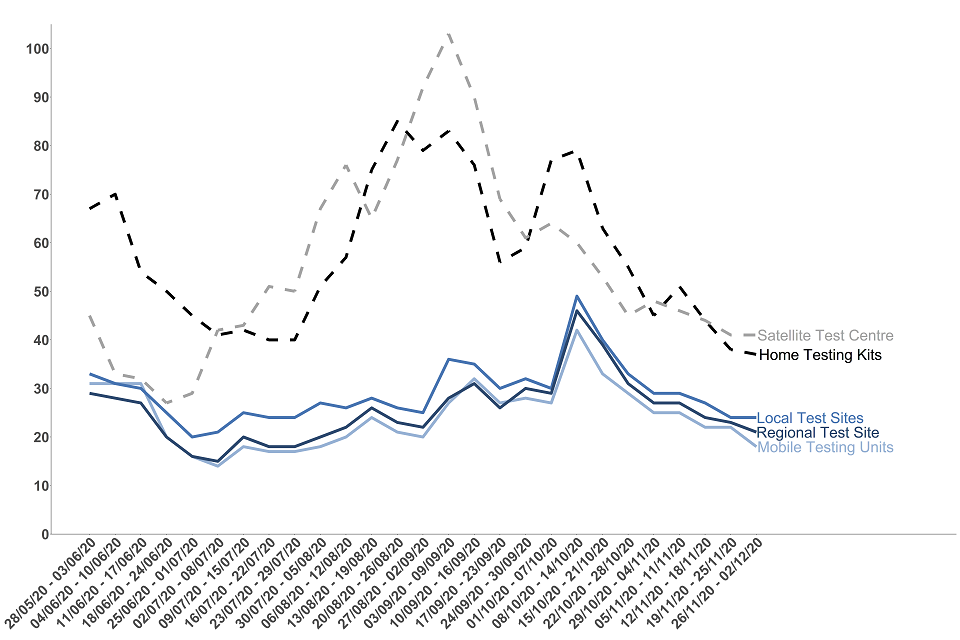 In the first month of Test and Trace, there was an initial reduction in the median time taken to receive a test result for in-person tests (regional test sites, local test sites and mobile testing units). This began to gradually trend back up from the start of July until reaching a peak in the middle of October. Since this peak, turnaround times have decreased.