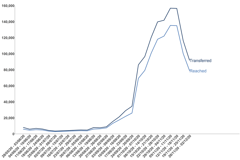 91,578 people were transferred to the contact tracing system between 26 November and 2 December, a continuation of the decrease observed in the previous week. The number of people transferred is still over 10 times higher than the number transferred at the end of August.