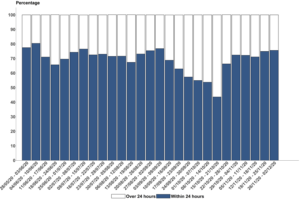 Between 26 November and 2 December, 91.0% of pillar 1 test results were made available within 24 hours. This has remained broadly consistent since Test and Trace began.
