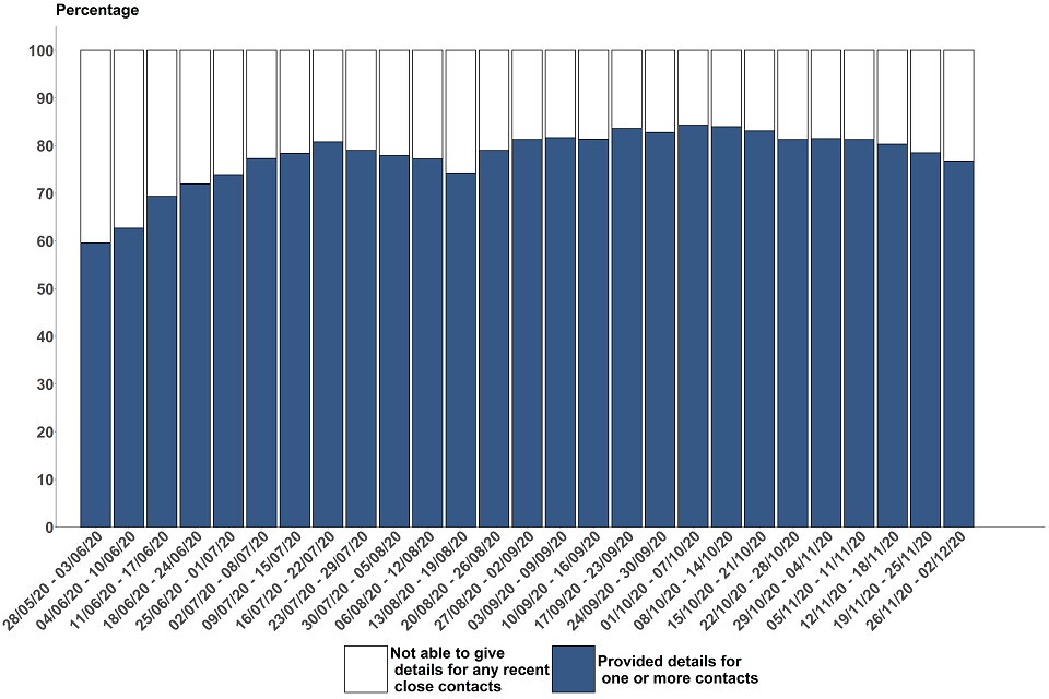 Of those transferred to the contact tracing system between 26 November and 2 December, 86.0% were reached and asked to provide information about their contacts. This has remained consistent over the past 5 weeks.