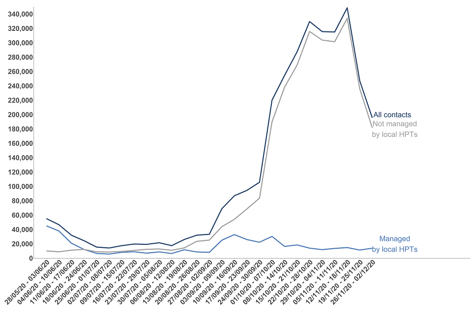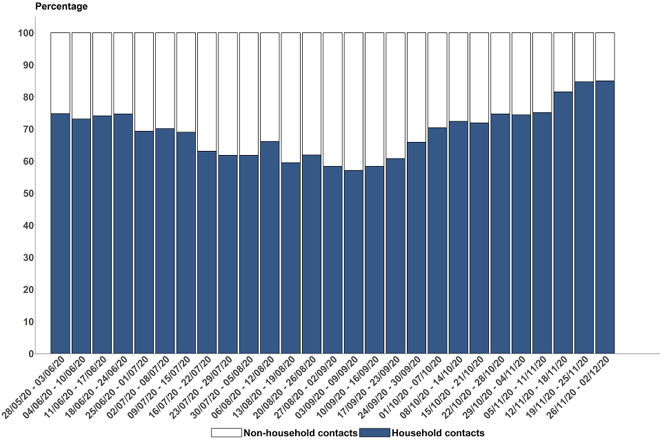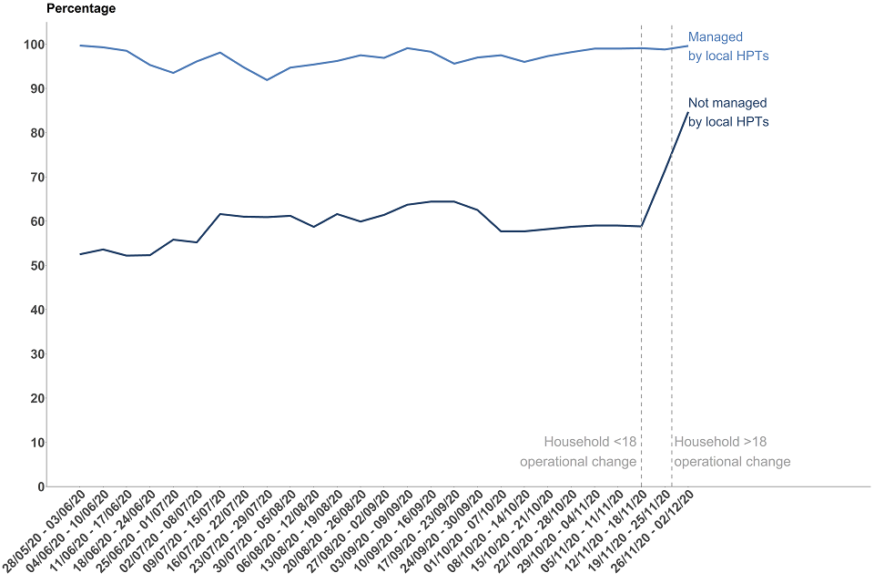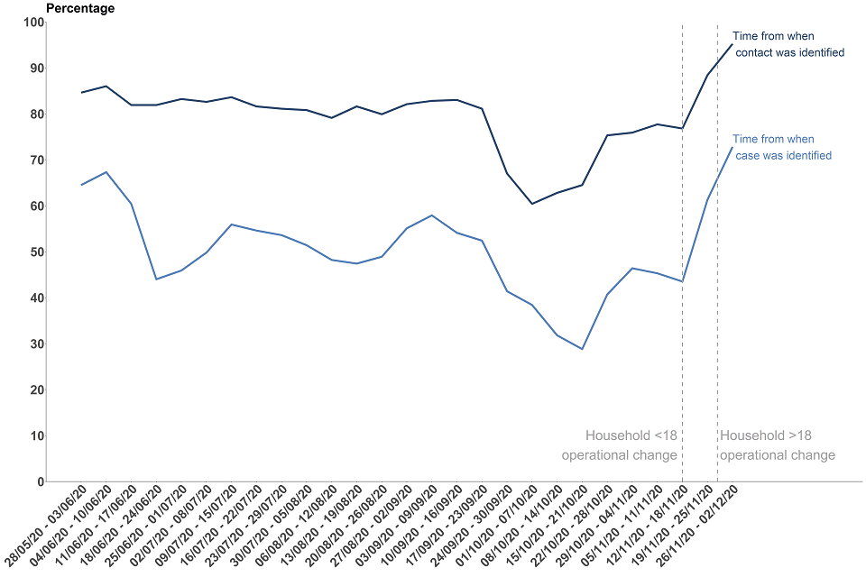 From 18 November, there is a change in how household contacts under 18 are reached. These changes mean that under-18s in a household will no longer be contact traced individually, providing the parent or guardian in the household confirms they have completed their legal duty to inform their child to self-isolate. From 27 November, this change has been extended to cover adults in the same household, so they have the option to be traced via a single phone call. These operational improvements have resulted in an increase in the proportion of contacts reached and the proportion reached within 24 hours.