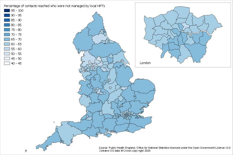 If NHS Test and Trace is not able to reach an individual testing positive or if no communication details are available, then it is not always possible to know if the case should be managed by a local HPT or not. Therefore, these breakdowns are not available. ↩