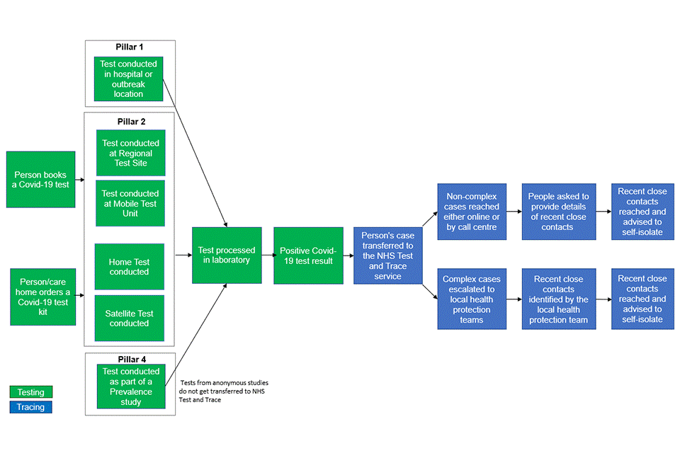 NHS Test and Trace starts with an individual taking a test, either in pillar 1 (testing in hospitals and outbreak locations, pillar 2 (national swab testing) or pillar 4 (prevalence studies). Those who go on to test positive will have their case transferred to NHS Test and Trace for contact tracing.