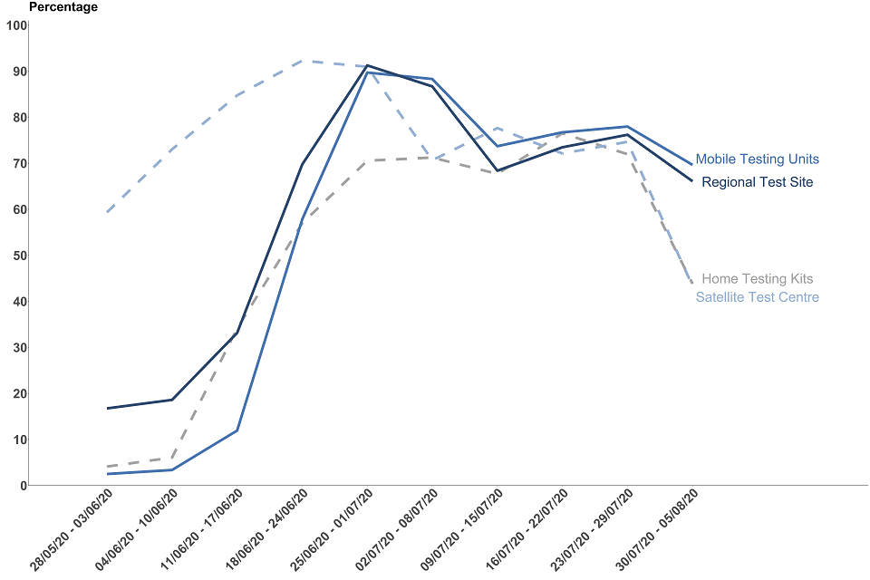 The time taken to receive a test result after taking a test has increased between 30 July and 5 August compared to the previous week for all routes. The biggest increases were seen in home testing kits and satellite test centres, 43.6% of test results by these routes were received within 48 hours in the most recent week compared to 72.9% in the previous week. These increases are mainly due to an IT systems failure at one of the laboratories which resulted in a delay to the processing of results.