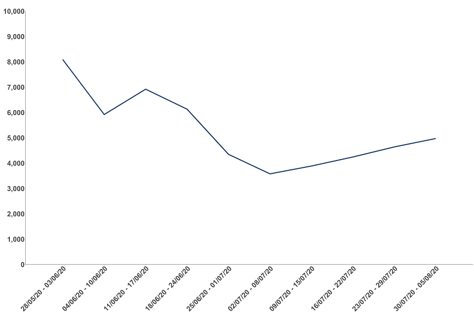 Between 30 July and 5 August, 4,973 people were transferred to the contract tracing system. This correlates with the number of people testing positive which has also been on the increase since the beginning of July. The number of people transferred is still 39% lower compared to when Test and Trace launched at the end of May due to the overall reduction in people testing positive for coronavirus (COVID-19).