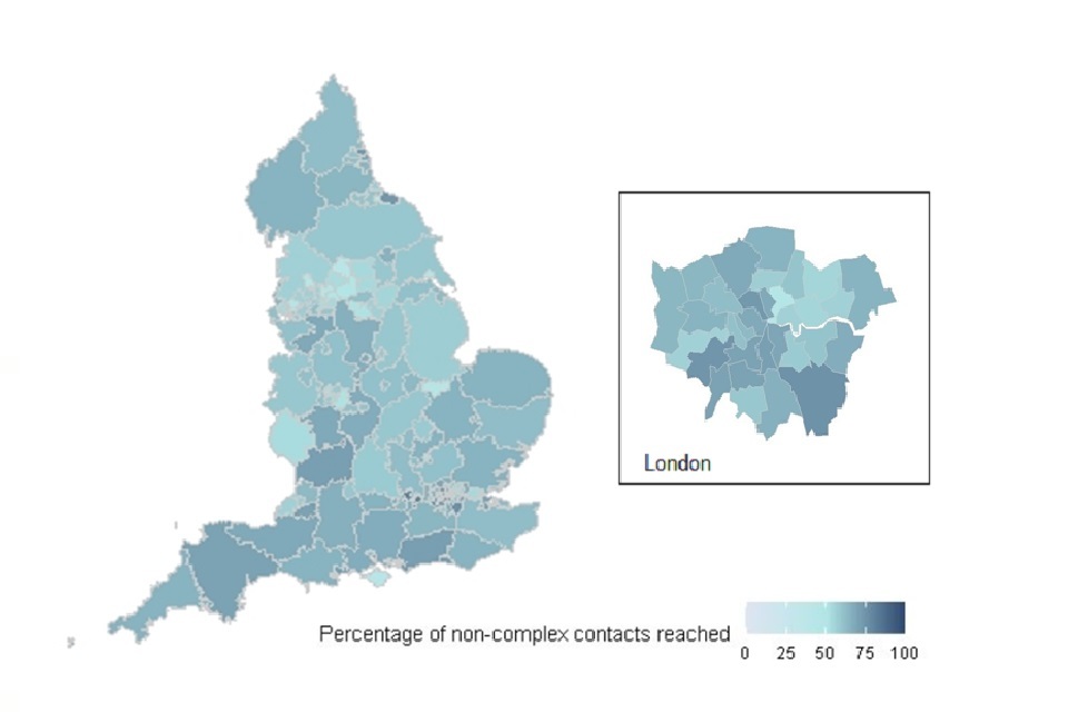 - close contacts identified for complex and non-complex cases, and the time taken for them to be reached, England