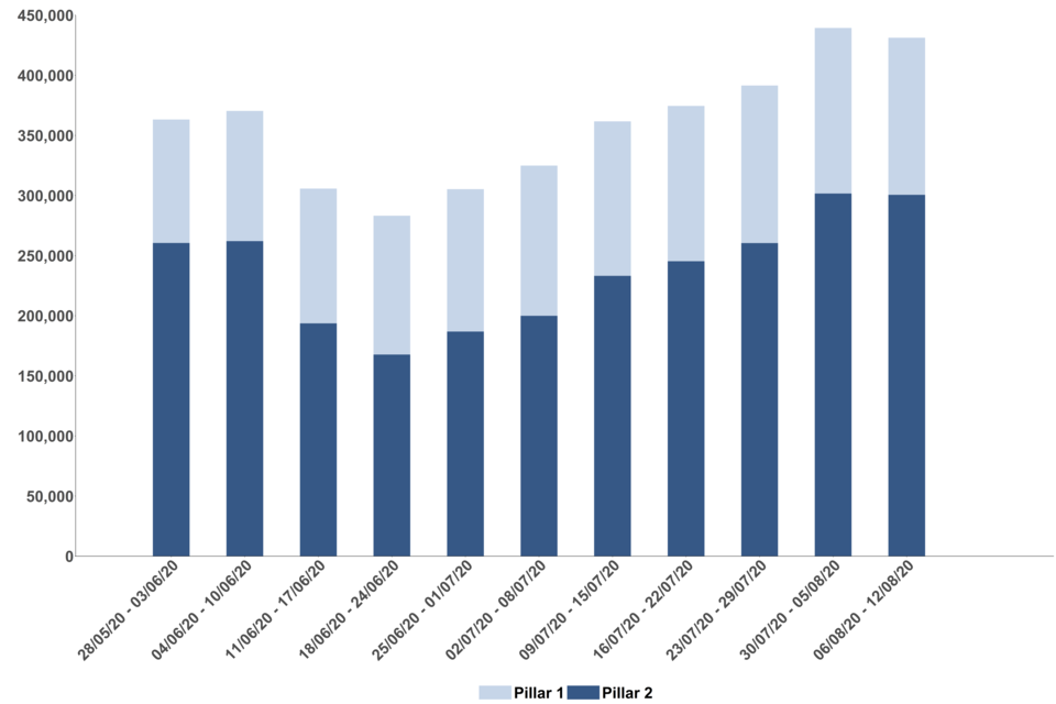 1,204,118 tests were processed in the UK, across all pillars, between the week from 6 August to 12 August, this is approximately consistent with the previous week.