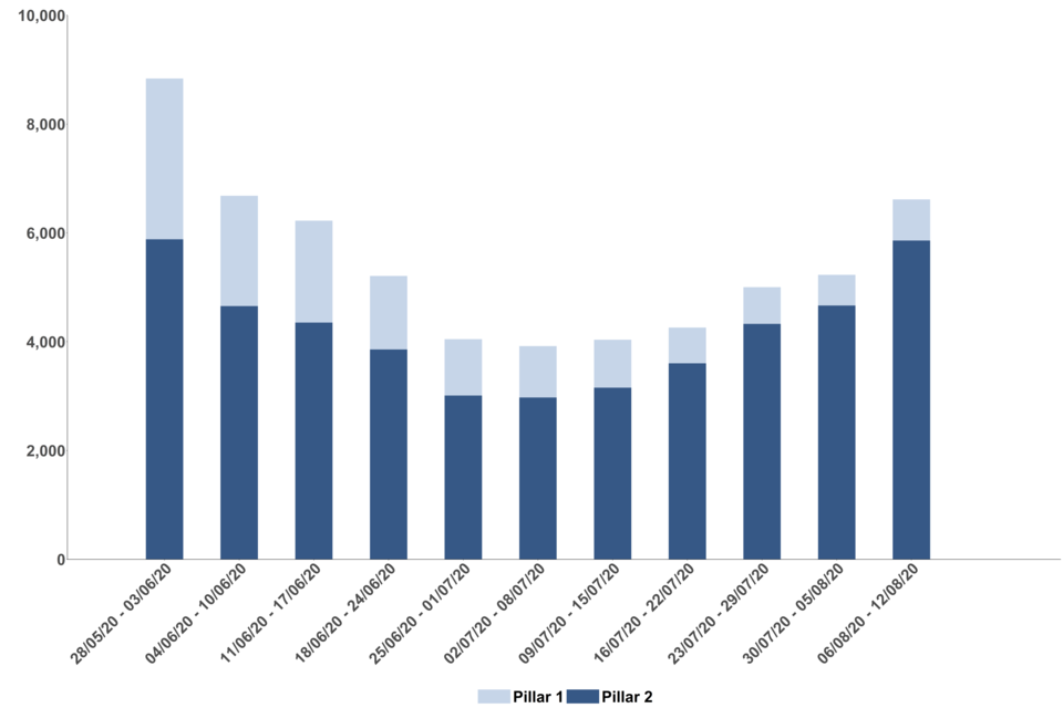 Since Test and Trace launched at the end of May, 3,951,073 people have been tested, of which 66.1% were tested under pillar 2 (national swab testing) and 33.9% under pillar 1 (testing in hospitals and outbreak locations). The number of people tested increased from mid-June to the beginning of August, however this has decreased slightly in the latest week. The number of people tested under pillar 2 has remained similar since the previous week, in comparison to people tested under pillar 1 which has decreased by 5%.