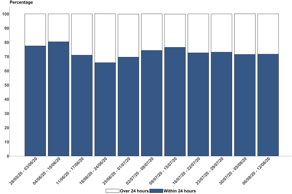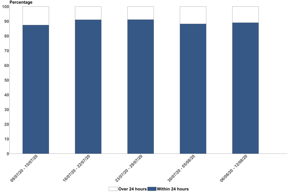 Almost 9 out of 10 pillar 1 test results were made available within 24 hours of the laboratory receiving the test. This proportion has remained similar since reporting began from 9 July