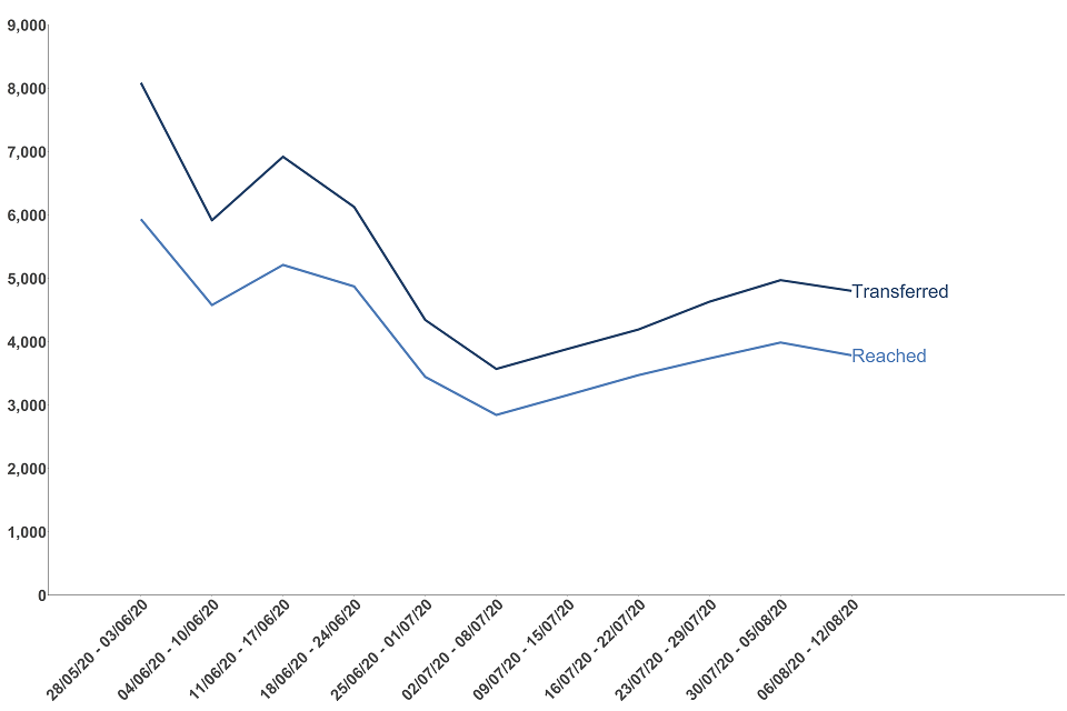 The number of people transferred is 41% lower compared to when Test and Trace launched at the end of May due to the overall reduction in people testing positive for coronavirus (COVID-19).