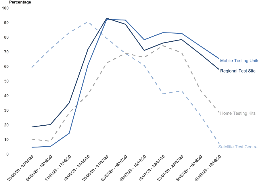 However, since the end of July, the time taken to receive a test result has increased across all routes. These increases are due to an IT systems failure at one of the laboratories which resulted in a delay to the processing of results. In addition, the increase of tests across all routes has resulted in backlogs in some laboratories. The biggest increases were seen in home testing kits and satellite test centres, 14.5% of test results by these routes were received within 48 hours in the most recent week compared to 33.2% in the previous week. For in-person tests (mobile testing units and regional test centres), 60.5% were received within 24 hours compared to 70.3% in the previous week.