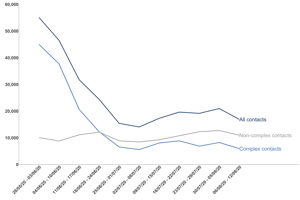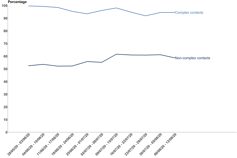 In the latest week, 309 people, who were reached and asked to provide details of close contacts, were classified as complex cases whereas 3,478 people were classified as non-complex. For more information on the different categories of cases and the outcomes of contact tracing see the terminology section.