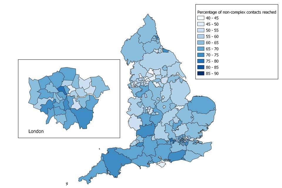 - close contacts identified for complex and non-complex cases, and the time taken for them to be reached, England