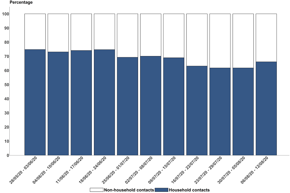 16,897 people were identified as coming into close contact with someone who has tested positive between 6 August and 12 August. Of these, 71.3% were reached and asked to self-isolate, compared to 74.2% in the previous week. This percentage has remained approximately constant for the last 5 weeks.