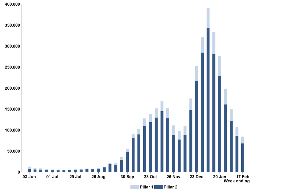 Between 11 February and 17 February, 2,580,210 people were tested for coronavirus (COVID-19) at least once in the reporting week,[footnote 4] a 14% decrease compared to the previous week.