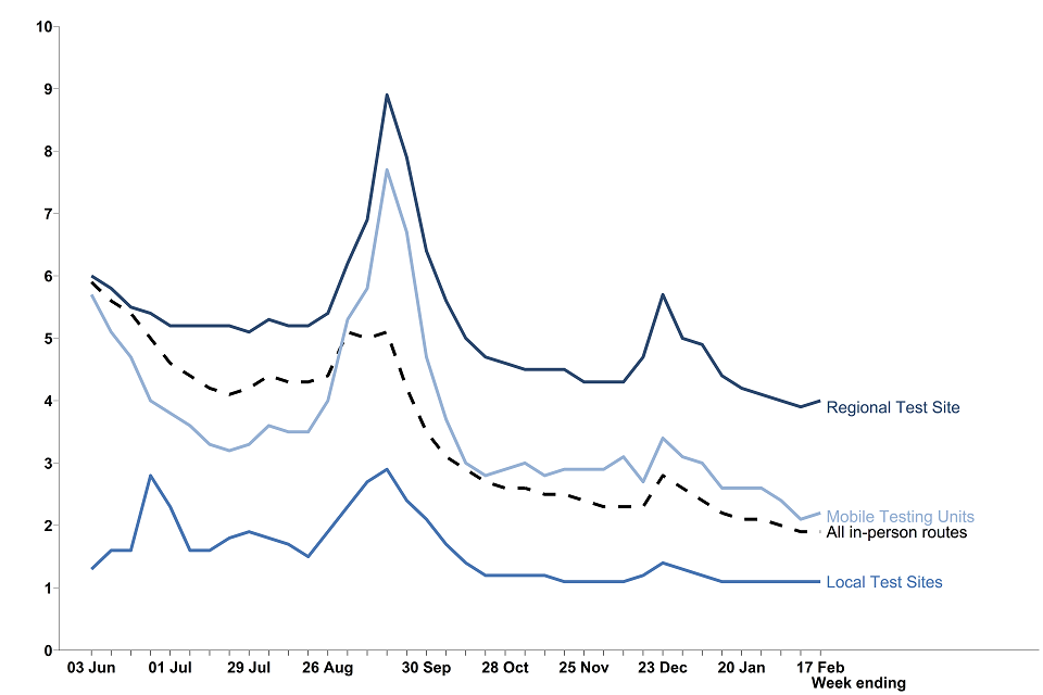 Between 11 February and 17 February 2021, the median time taken to receive a test result for regional test sites fell from 17 hours to 15 hours compared to the previous week. The median time for local test sites also fell, from 19 hours to 18 hours, whilst the median time for mobile testing units stayed the same at 17 hours during the same period.