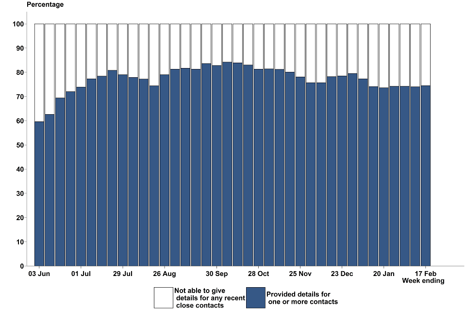 Of the cases transferred to the contact tracing system between 11 February and 17 February, 87.9% were reached and asked to provide information about their recent close contacts. This has remained broadly consistent over the past 3months.