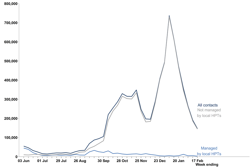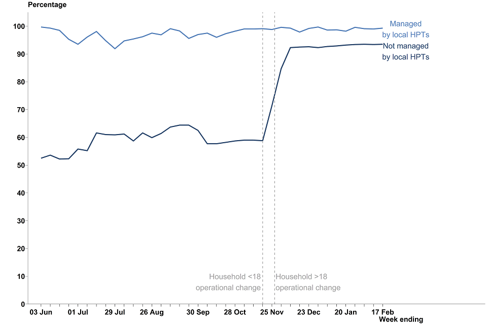 Between 11 February and 17 February 2021, 98.0 % of contacts who weren’t managed by local HPTs were reached and told to self-isolate within 24 hours of being identified, consistent with 97.9% the previous week.