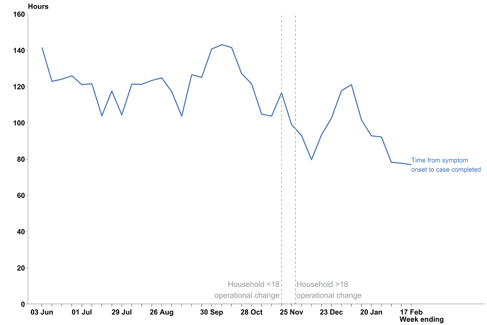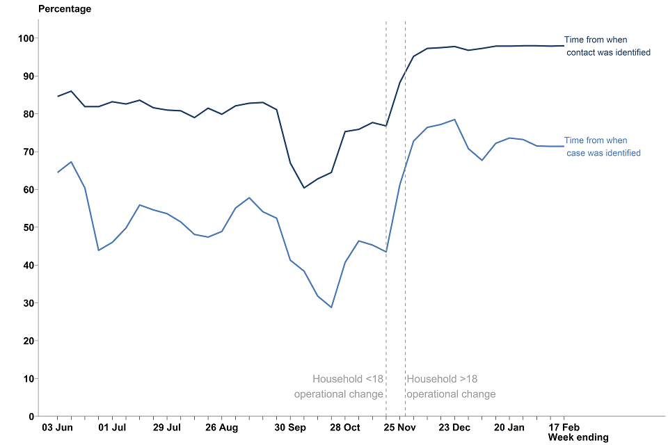 Between 11 February and 17 February 2021, 120,165 (90.2%) contacts that were reached and told to self-isolate were reached within 3 days of the case that reported them taking a test which subsequently returned a positive result. This is consistent with 90.1% in the previous week.