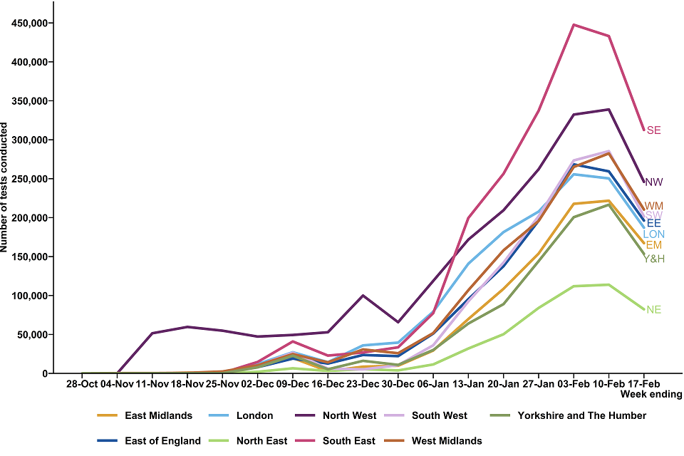 The number of LFD tests conducted has been increasing overall across all regions between late December 2020 and the beginning of February 2021, however all regions have decreased in the latest week, which coincides with half-term. Between 11 February and 17 February 2021, the most LFD tests were conducted in the South East followed by the North West, similar to previous weeks.