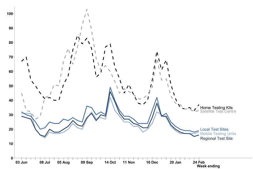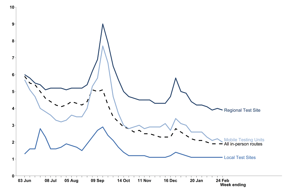 Turnaround times for pillar 2 (virus testing for the wider population) for all in-person testing routes have become shorter overall since the beginning of December 2020 but have got longer (regional testing sites, local testing sites and mobile testing units) in the most recent week, compared to the previous week. In the most recent week, 82.9% of in-person tests were received within 24 hours compared to 86.8% in the previous week.