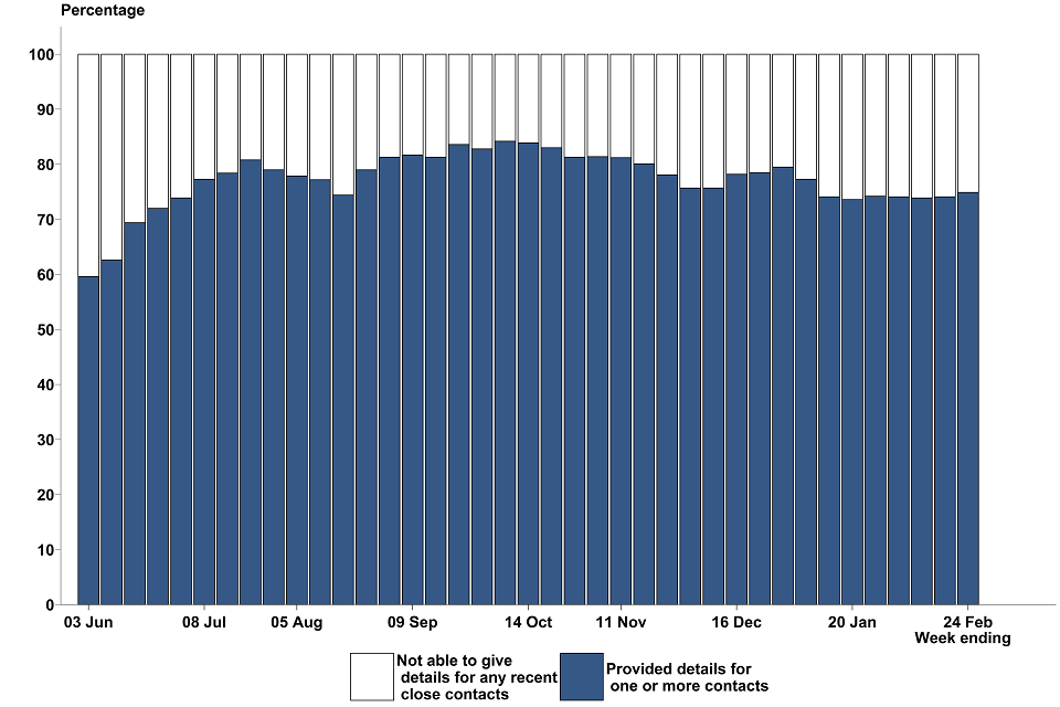 Of the cases transferred to the contact tracing system between 18 February and 24 February, 88.5% were reached and asked to provide information about their recent close contacts. This has remained broadly consistent over the past 4 months.