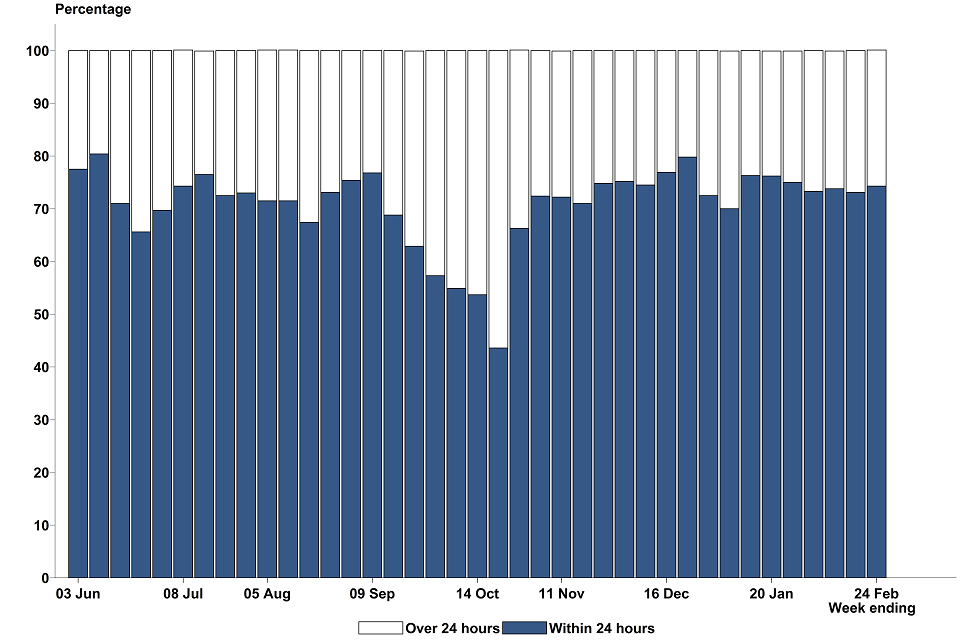 Between 18 February and 24 February 2021, 96.3% of pillar 1 test results were made available within 24 hours. Turnaround times for pillar 1 have been consistently around 95% for the last 7 weeks, and since reporting began 88.0% of test results have been made available within 24 hours.