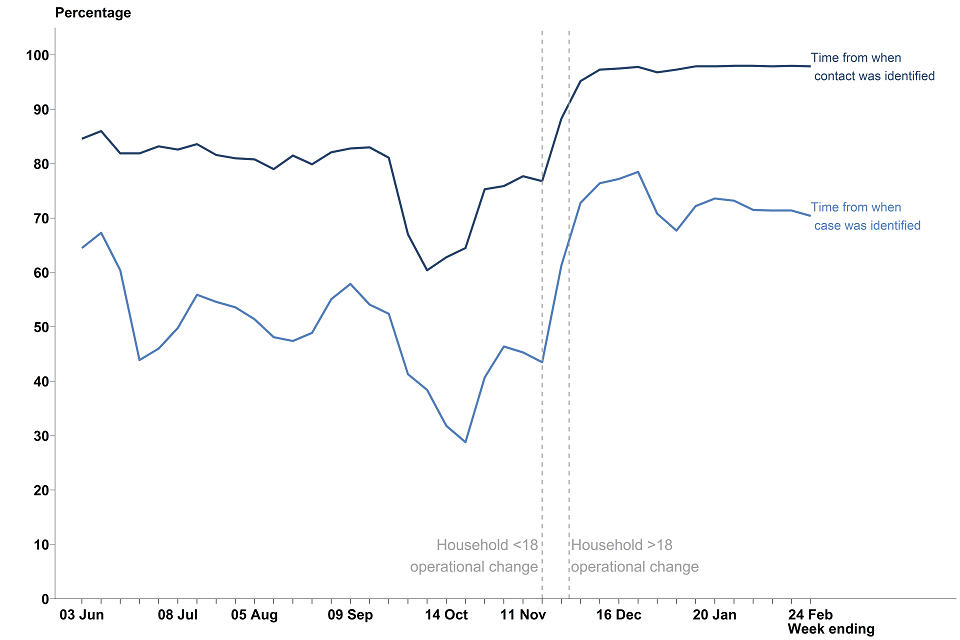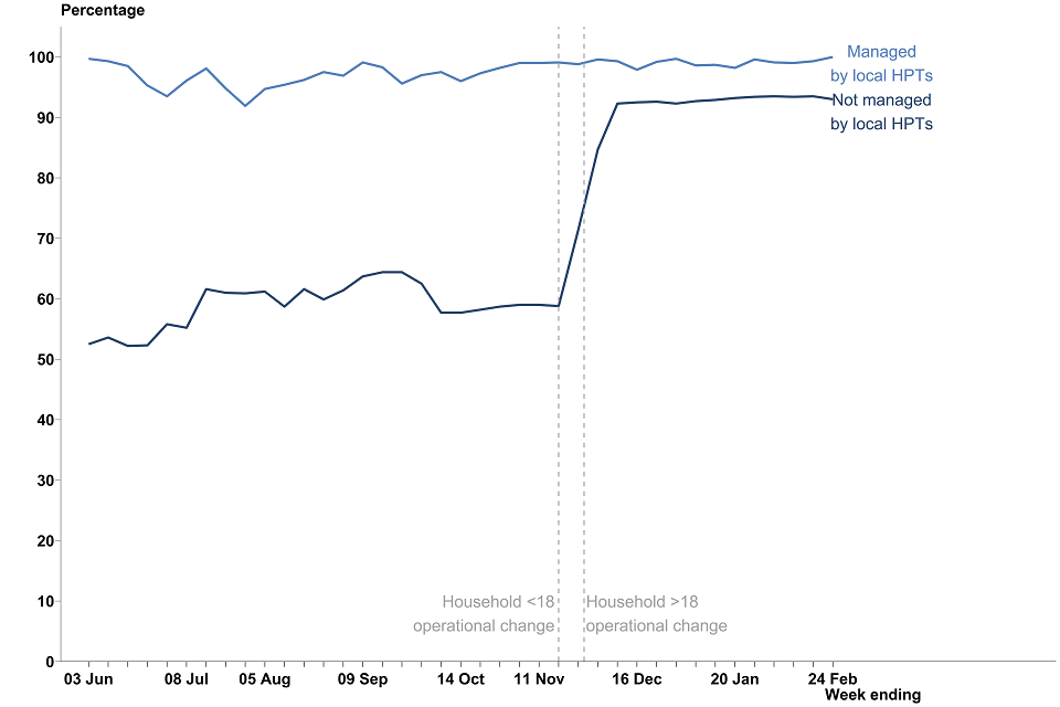 For contacts not managed by local HPTs who were told to self-isolate, 97.9% were reached within 24 hours of being identified. This has remained broadly similar for the last 12 weeks.[footnote 14]